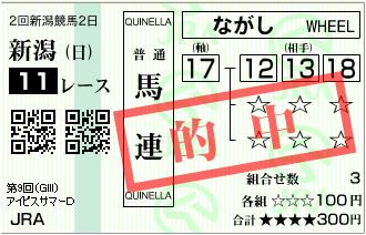 本命は外れましたが、馬券は馬連ですが的中しました。